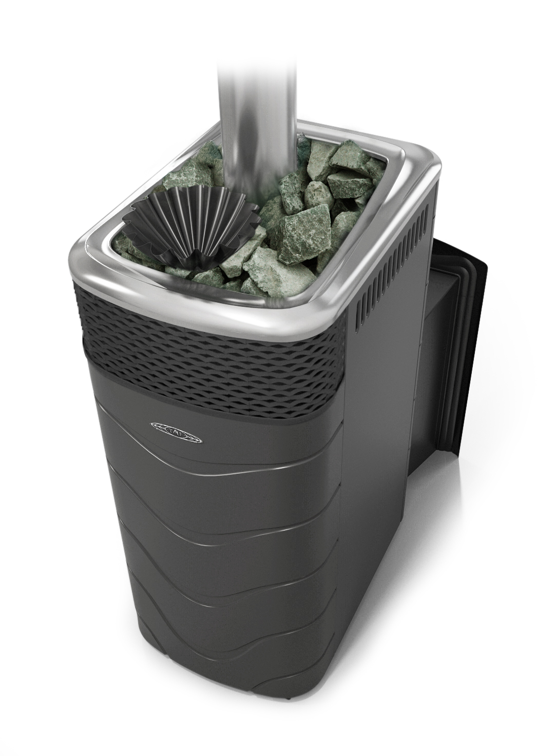 Увеличенная и усиленная двойным сварным швом закрытая первичная каменка обладает достаточной теплоемкостью для частых интенсивных подач воды.