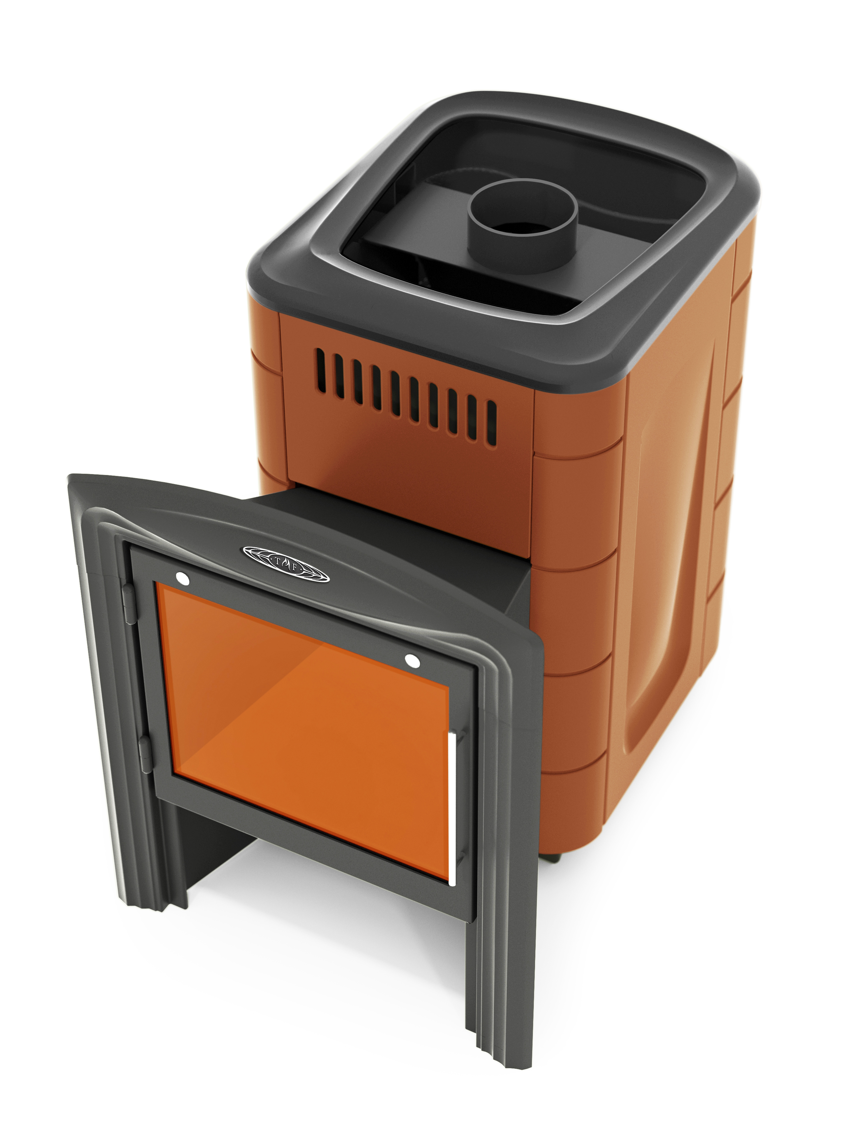 Эта модель выпускается в двух цветовых вариантах – терракота и антрацит. Доступна модификация «Витра» с большим светопрозрачным экраном диагональю 42 см. Эта печь идеально подходит для небольших бань и в большей степени ориентирована на режим «финской сауны» с повышенной температурой.
