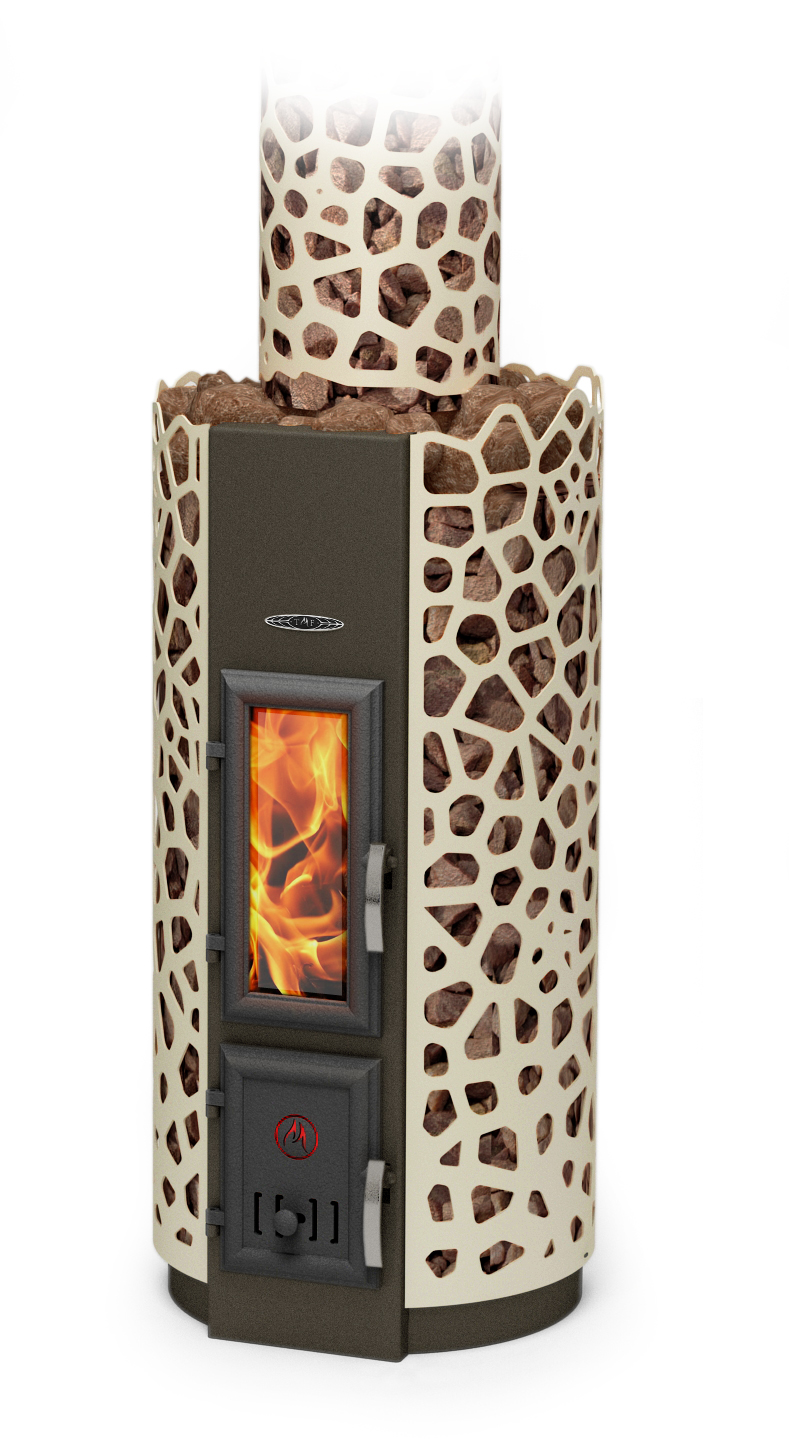 Камни долго держат тепло, хорошо экранируют сильное тепловое излучение от металлической топки и прекрасно нагревают воздух помещения естественной воздушной конвекцией через сетчатый кожух.